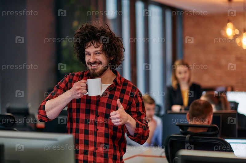 Сосредоточенный профессионал: интересный мужчина с чашкой кофе в офисе, окруженный компьютерами