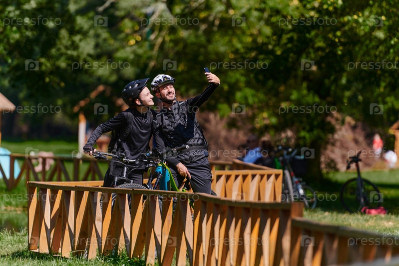 Счастливая пара, одетая в профессиональную велосипедную экипировку, наслаждается романтической велопрогулкой по парку, окруженному современными природными достопримечательностями, излучая любовь и счастье