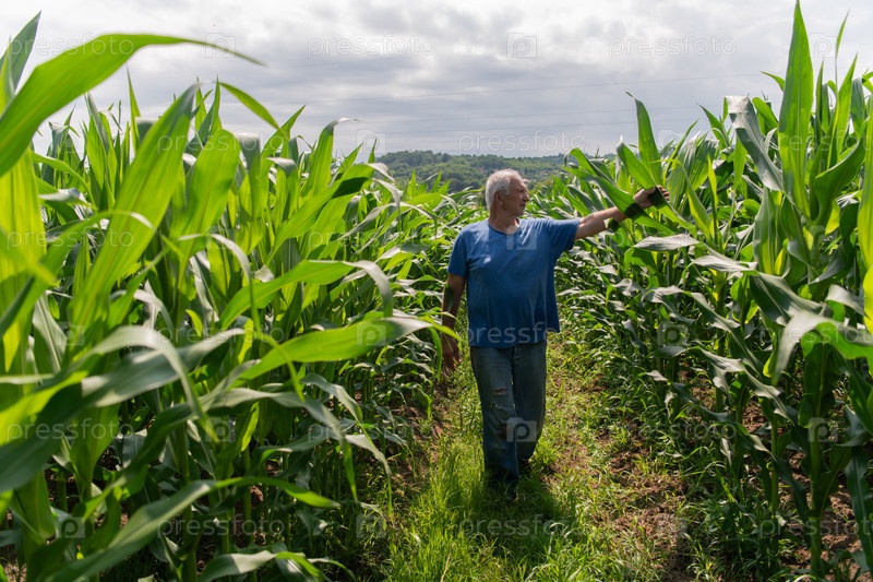 Пожилой фермер идет по своим полям кукурузы, малины и черники