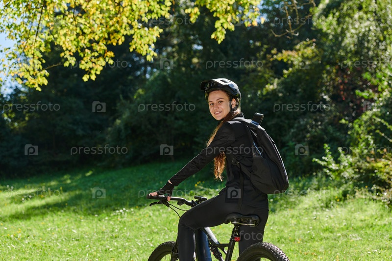 В лучезарных объятиях солнечного дня радостная девушка, облаченная в профессиональную велосипедную экипировку, находит чистое блаженство и жизненную силу, катаясь по парку на своем велосипеде, а ее заразительный смех отражает беззаботную гармонию момента