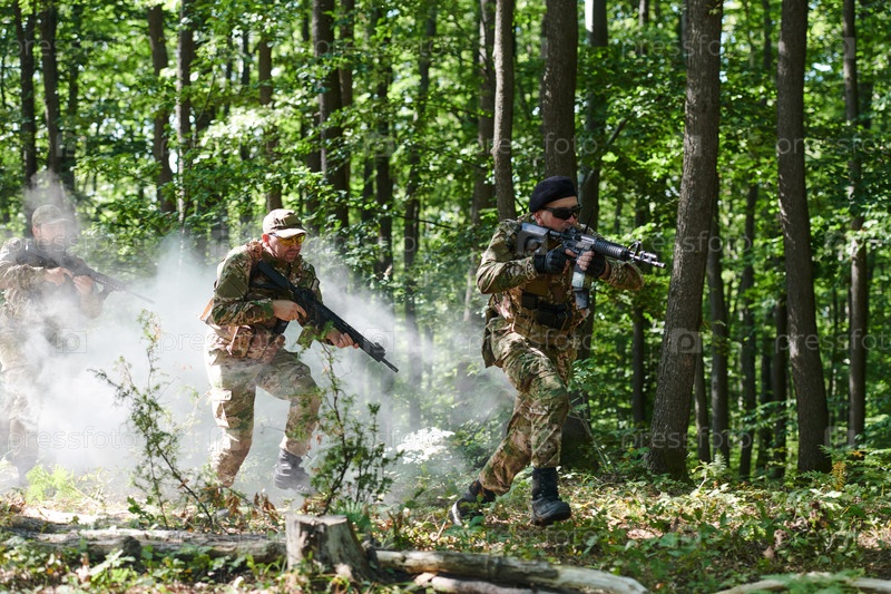 Специализированное военное антитеррористическое подразделение проводит секретную операцию в густом, опасном лесу, демонстрируя точность, дисциплину и стратегическую готовность