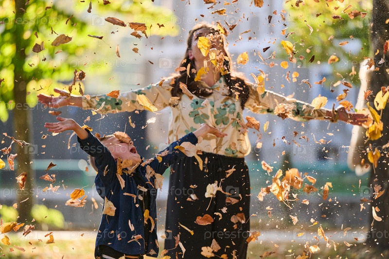 Современная женщина с радостью играет со своим сыном в парке, подбрасывая листья в прекрасный осенний день, запечатлевая суть семейной жизни и теплоту отношений матери и сына в разгар осени