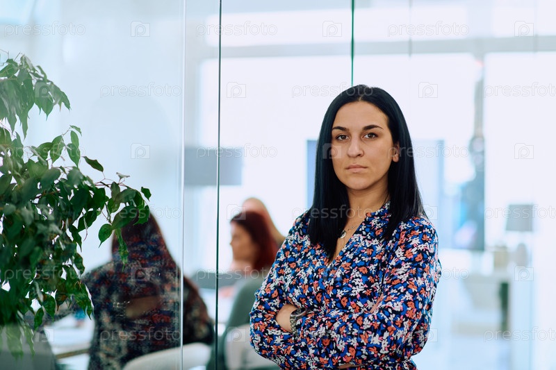 Портрет уверенной в себе деловой женщины со скрещенными руками в офисной обстановке