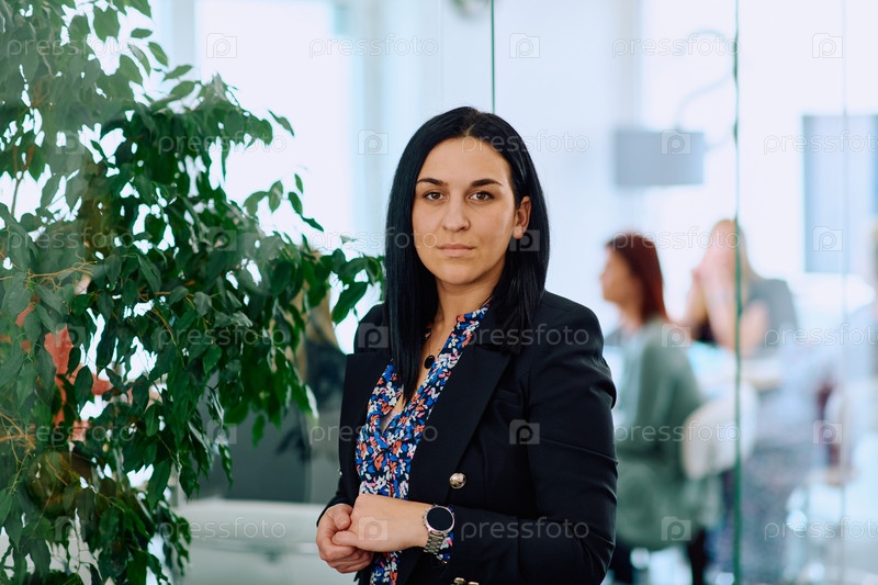 Портрет уверенной в себе деловой женщины со скрещенными руками в офисной обстановке