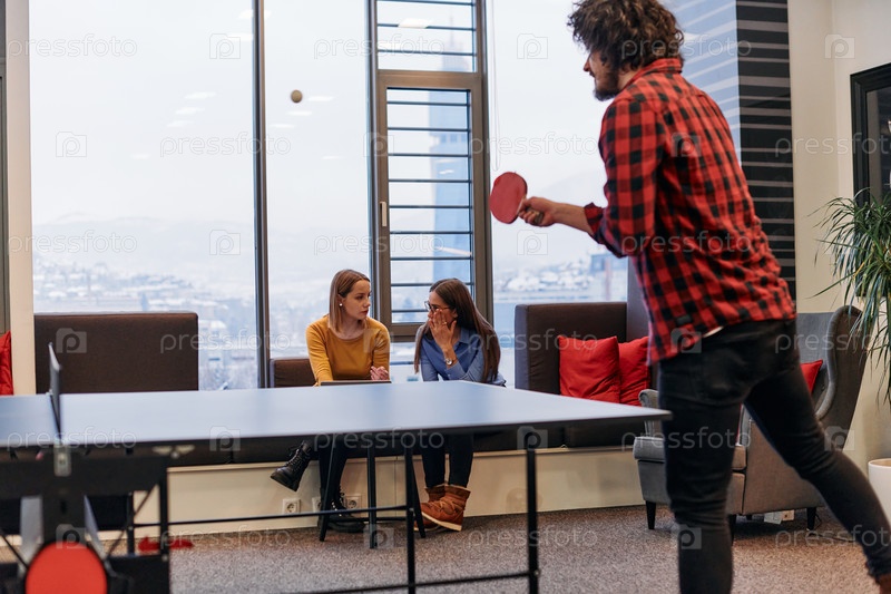 Коллеги по бизнесу отдыхают от работы, чтобы поиграть в настольный теннис, способствуя командной работе и товариществу на рабочем месте