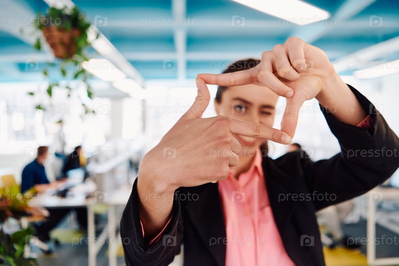 Крупный план рук, улыбающаяся деловая женщина, делающая жест кадра в современном ярком коворкинге открытого пространства стартап-офиса