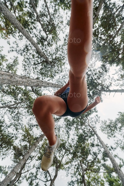 Авантюрная женщина преодолевает лесные препятствия с решимостью и ловкостью