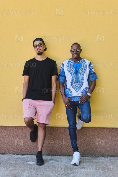 Двое друзей-мужчин: афроамериканский подросток в традиционной суданской одежде, прислонившийся к желтой стене