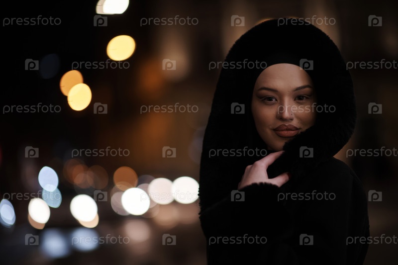 Мусульманка идет по городской улице холодной зимней ночью в хиджабе