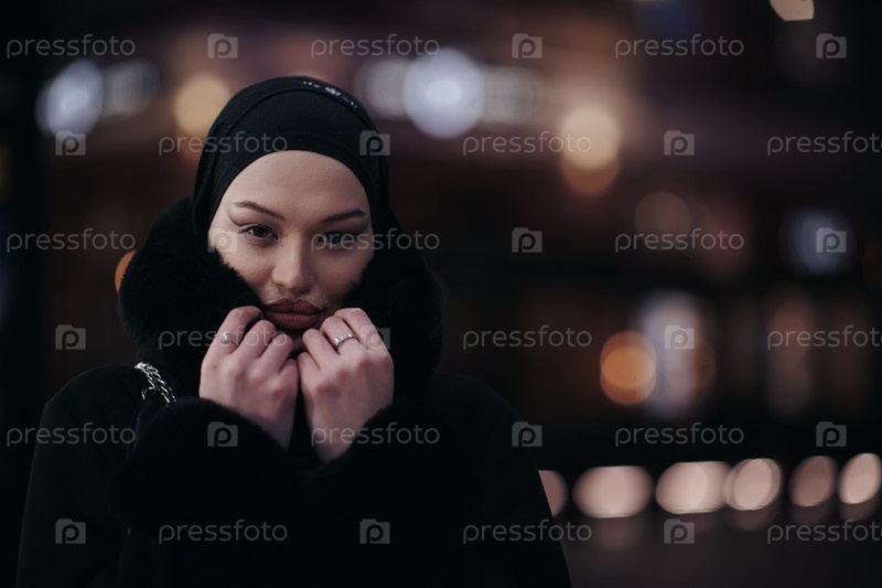 Мусульманка идет по городской улице холодной зимней ночью в хиджабе