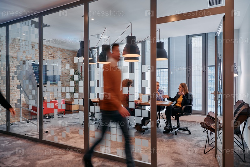 В динамичной суете деловой среды группа молодых специалистов идет по коридору рядом со своим офисом, в то время как их коллеги сотрудничают внутри, что символизирует командную работу и производительность