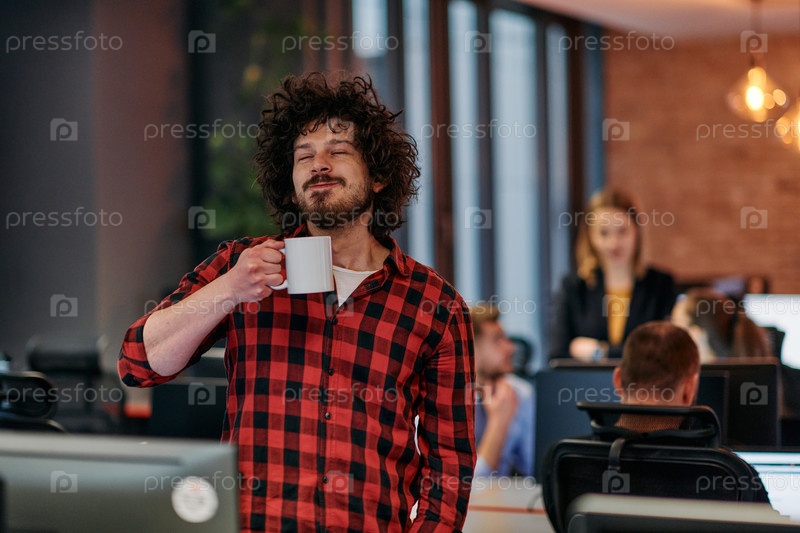 Сосредоточенный профессионал: интересный мужчина с чашкой кофе в офисе, окруженный компьютерами