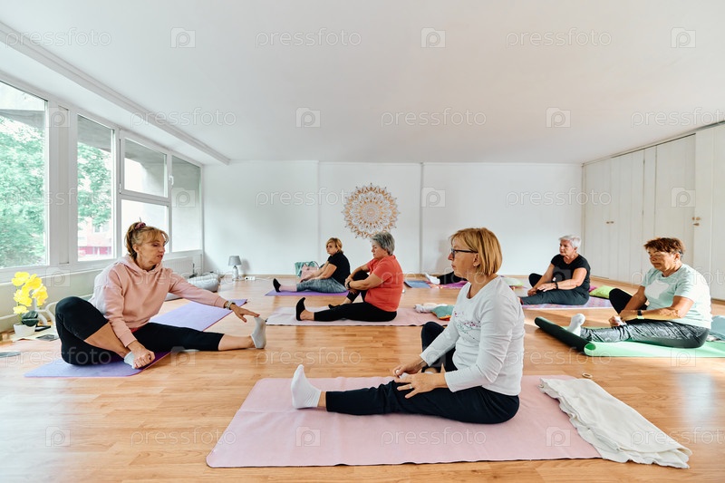 Группа пожилых женщин занимается различными упражнениями йоги, включая растяжку шеи, спины и ног, под руководством тренера в залитом солнцем месте, способствуя благополучию и гармонии