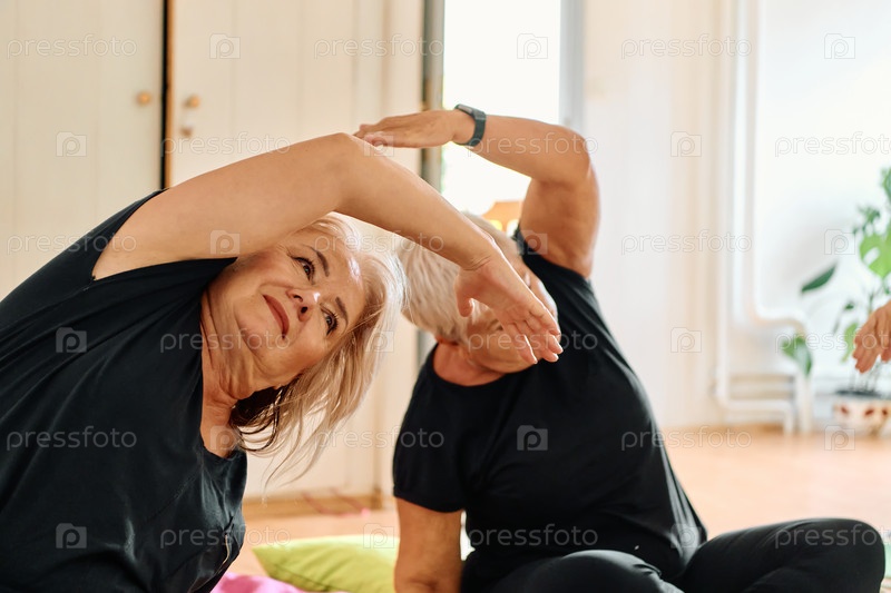 Группа пожилых женщин занимается различными упражнениями йоги, включая растяжку шеи, спины и ног, под руководством тренера в залитом солнцем месте, способствуя благополучию и гармонии