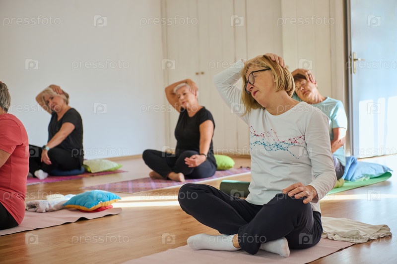 Группа пожилых женщин занимается различными упражнениями йоги, включая растяжку шеи, спины и ног, под руководством тренера в залитом солнцем месте, способствуя благополучию и гармонии