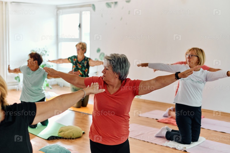 Группа пожилых женщин занимается различными упражнениями йоги, включая растяжку шеи, спины и ног, под руководством тренера в залитом солнцем месте, способствуя благополучию и гармонии