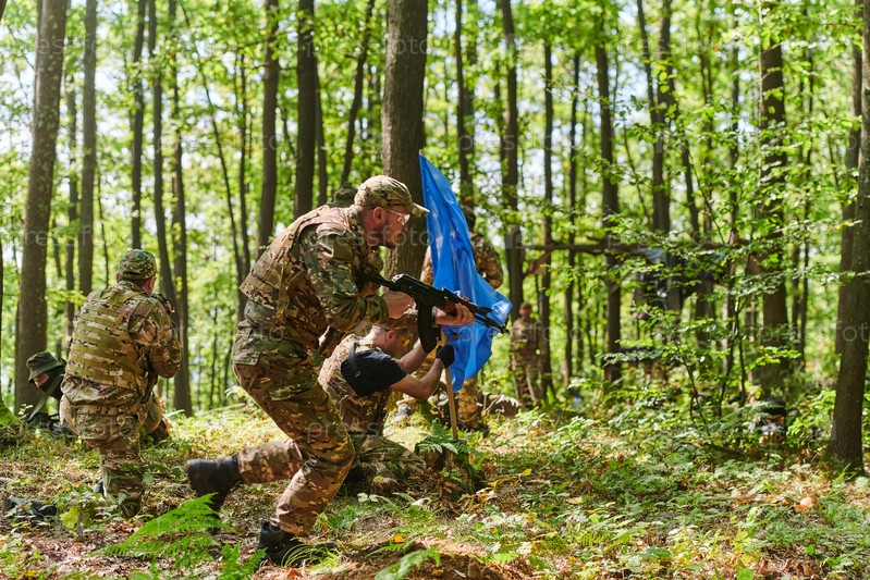 Дисциплинированное и специализированное военное подразделение, облаченное в камуфляж, осуществляющее стратегическое патрулирование и сохраняющее контроль в обстановке с высокими ставками, демонстрирующее свою точность, сплоченность и готовность к специаль