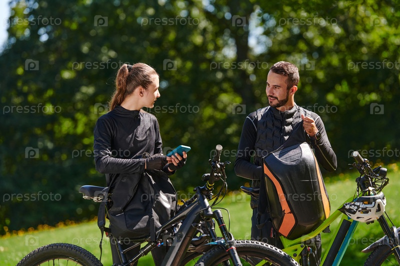 Милая парочка, вооруженная велосипедами и поглощенная планированием своего путешествия, проверяет свои мобильные телефоны и часы, планируя живописные маршруты в парке, органично сочетая технологии и приключения на свежем воздухе для восхитительного опыта