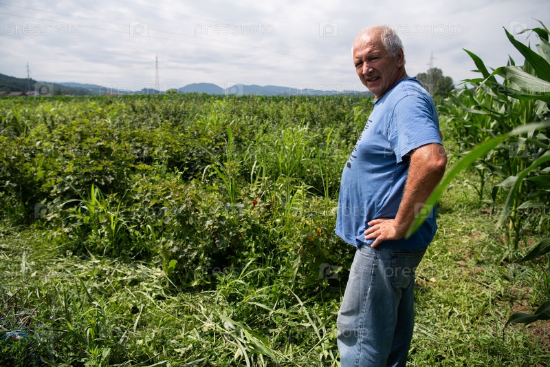 Пожилой фермер идет по своим полям кукурузы, малины и черники