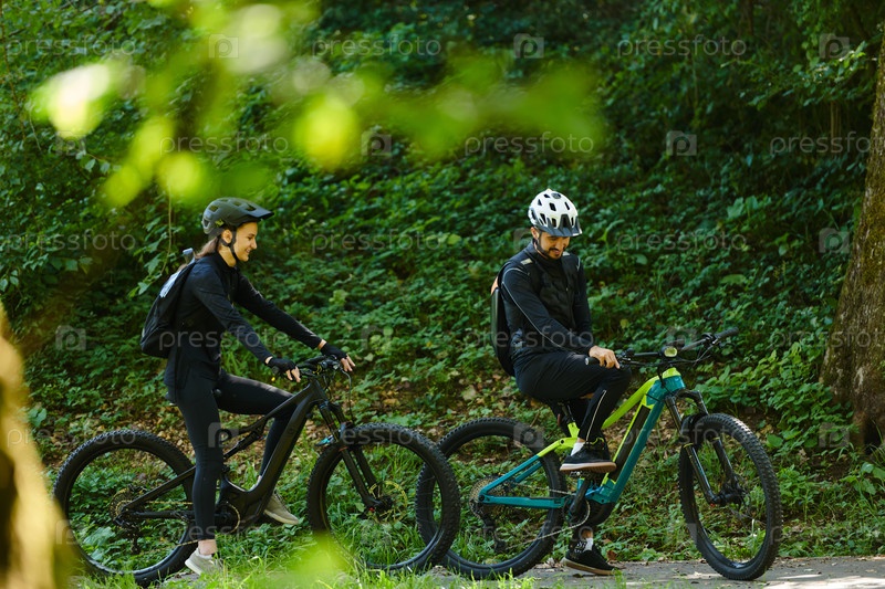 Счастливая пара, одетая в профессиональную велосипедную экипировку, наслаждается романтической велопрогулкой по парку, окруженному современными природными достопримечательностями, излучая любовь и счастье