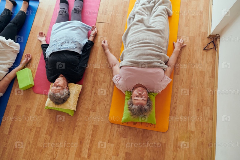 Вид сверху на группу пожилых женщин, которые занимаются различными упражнениями йоги, включая растяжку шеи, спины и ног, под руководством тренера в залитом солнцем месте, способствуя благополучию и гармонии