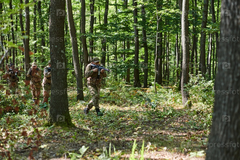 Специализированное военное антитеррористическое подразделение проводит секретную операцию в густом, опасном лесу, демонстрируя точность, дисциплину и стратегическую готовность