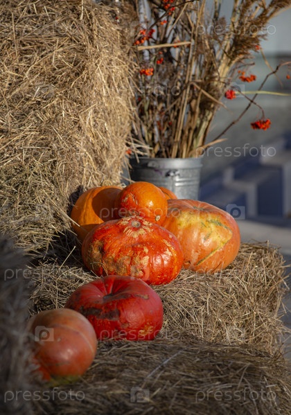 Осенний натюрморт с тыквами. Оранжевые тыквы, снятые крупным планом