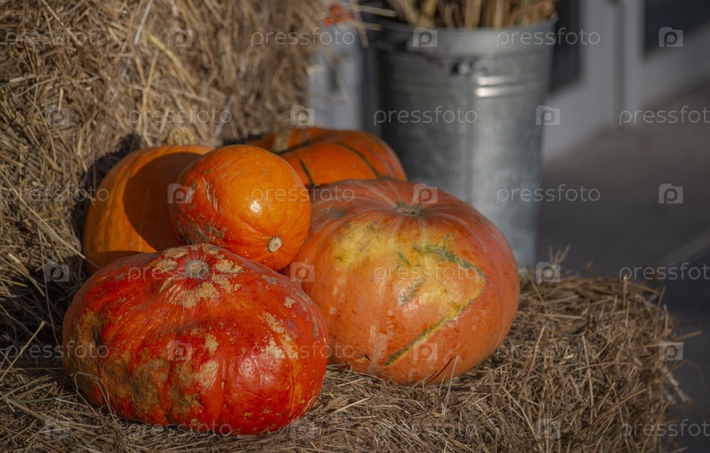 Осенний натюрморт с тыквами. Оранжевые тыквы, снятые крупным планом