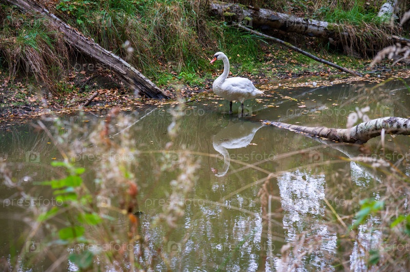 Лебедь на озере осенью. Белая птица в дикой природе