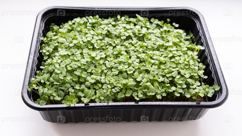 Микрозелень прорастает в черном ящике, ростки крупным планом