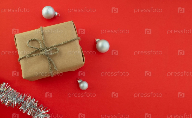 Рождественский праздничный фон с копией пространства. Подарок, елочные шары и мишура на красном фоне
