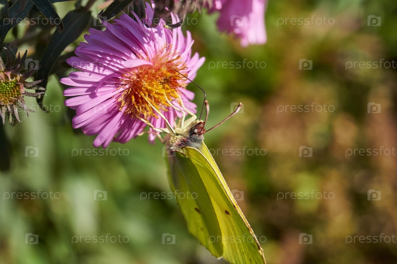 Gonepteryx rhamni) собирает нектар из цветов. дневная бабочка семейства белянок
