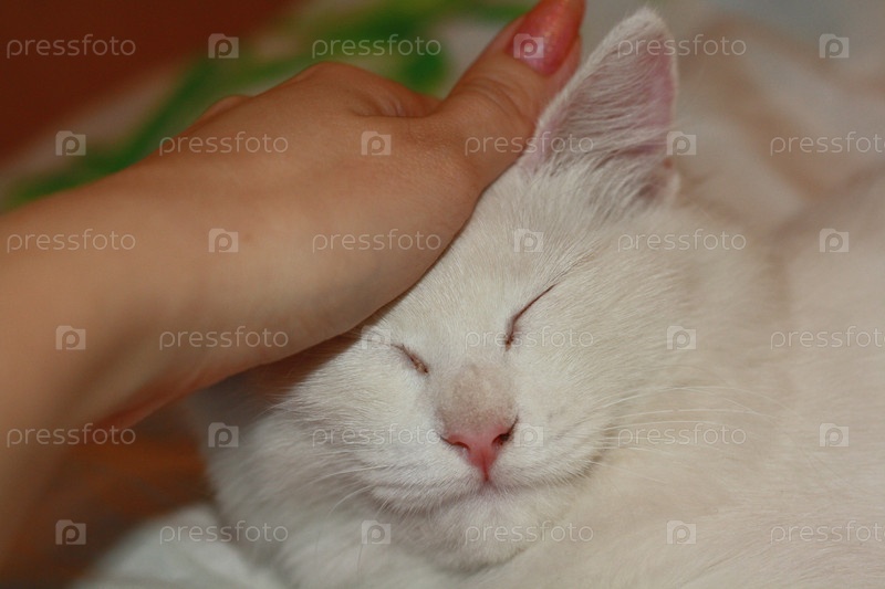 Женская рука с розовым маникюром гладит белую кошечку с розовым носиком