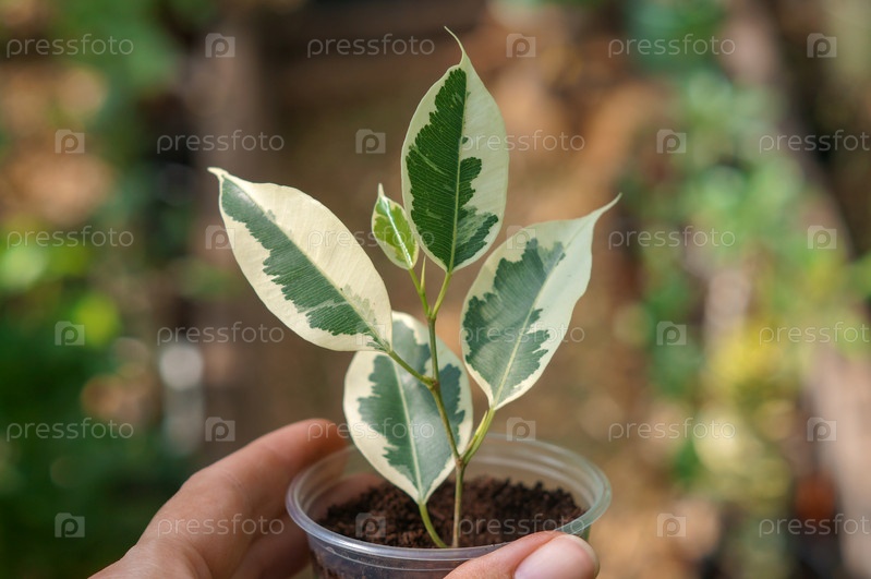 Небольшой укоренившийся побег фикуса Twilight в теплице на фоне других растений
