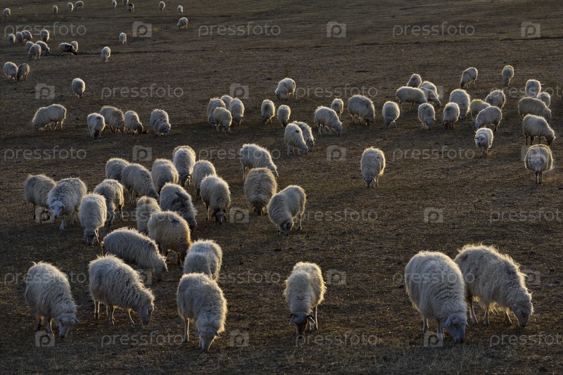 Россия. Северо-Восточный Кавказ. Дагестан. Стадо овец мирно пасется на склонах Кавказских гор на фоне последних лучей вечернего солнца