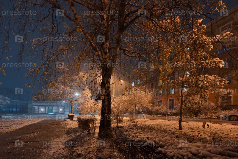 Новокузнецк, Россия. 01 ноября 2024 года. Живописный вид на деревья городского парка, покрытые первым осенним снегом и подсвеченные фонарями теплого и холодного света