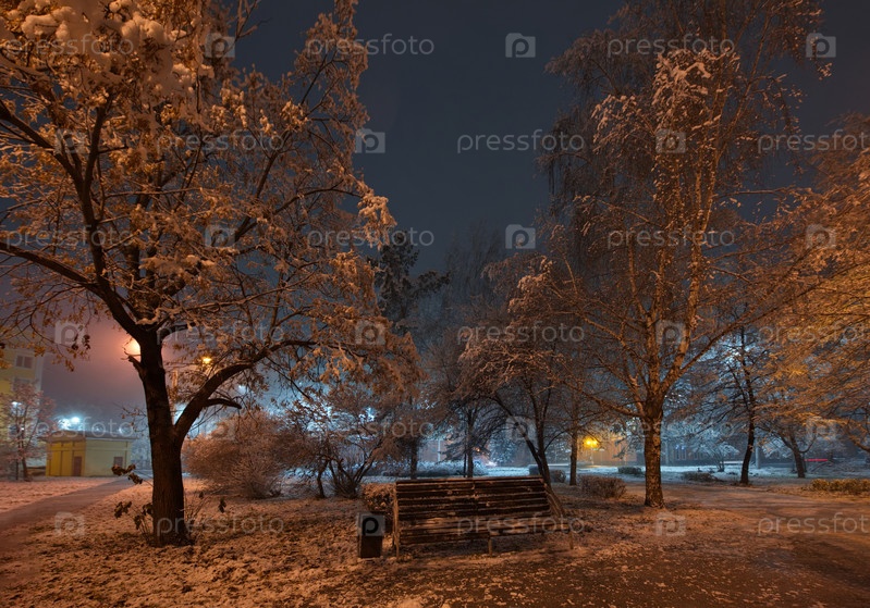 Новокузнецк, Россия. 01 ноября 2024 года. Живописный вид на деревья городского парка, покрытые первым осенним снегом и подсвеченные фонарями теплого и холодного света