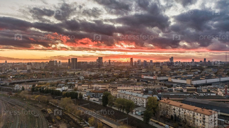 Вид 4K на вечернюю Москву при закате солнца, деловой квартал и жилые дома в отдалении