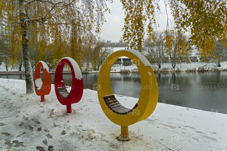Лавочки оригинальной круглой формы на берегу Малого Коньковского пруда. Улица Введенского, Предзимье, первый снег, пасмурный день в начале ноября