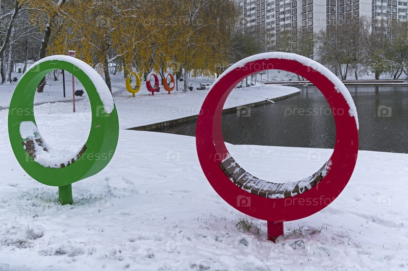 Лавочки оригинальной круглой формы на берегу Малого Коньковского пруда. Улица Введенского, Предзимье, первый снег, пасмурный день в начале ноября