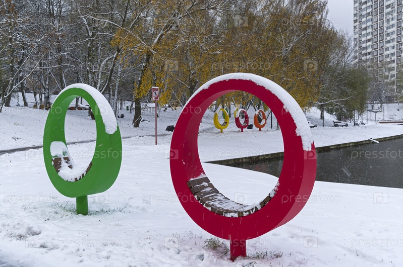 Лавочки оригинальной круглой формы на берегу Малого Коньковского пруда. Улица Введенского, Предзимье, первый снег, пасмурный день в начале ноября