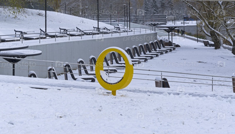 Первый снег в городе. Заснеженные пляжные лежаки у Большого Коньковского пруда. Улица Введенского, Москва, пасмурный день в начале ноября