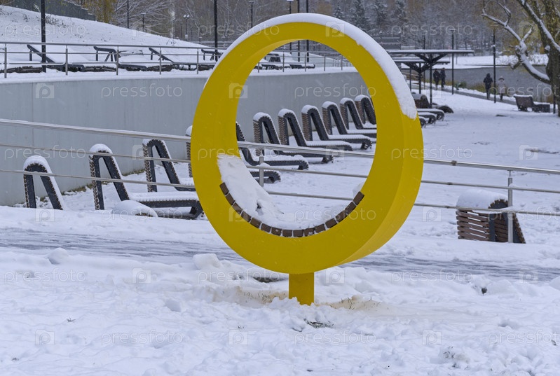 Первый снег в городе. Заснеженные пляжные лежаки у Большого Коньковского пруда. Улица Введенского, Москва, пасмурный день в начале ноября