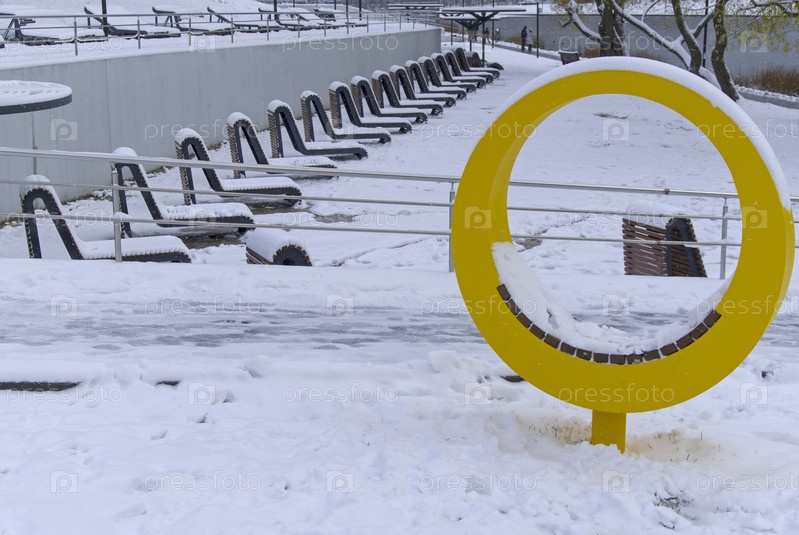 Первый снег в городе. Заснеженные пляжные лежаки у Большого Коньковского пруда. Улица Введенского, Москва, пасмурный день в начале ноября