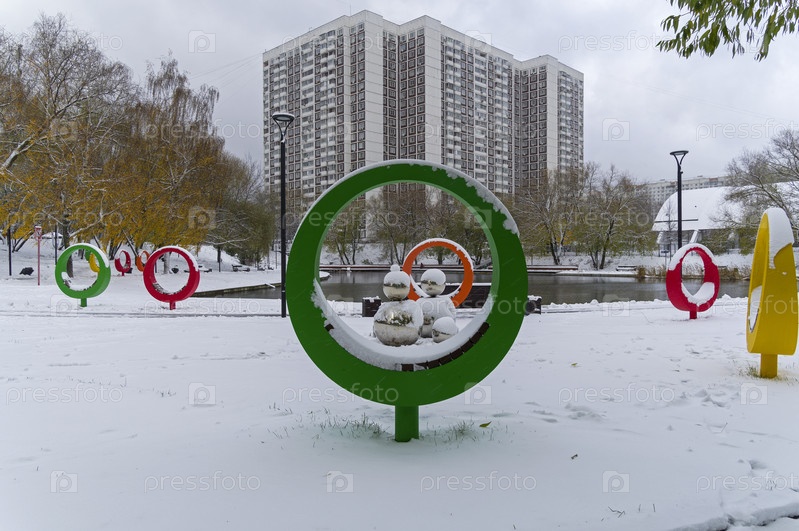 Лавочки оригинальной круглой формы на берегу Малого Коньковского пруда. Улица Введенского, Предзимье, первый снег, пасмурный день в начале ноября