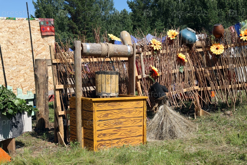 Модель деревенского колодца с ведром и плетнем с горшками и цветущими подсолнухами