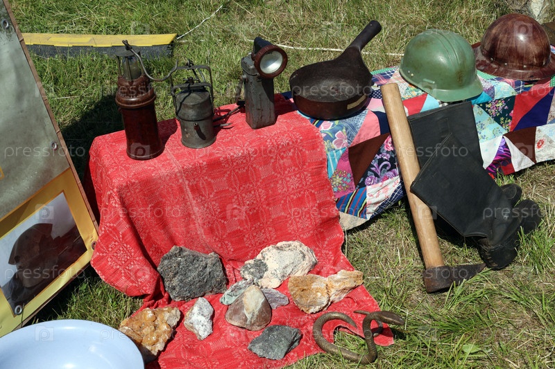 Старинные фонари, каски и другие инструменты, используемые для работы в шахтах