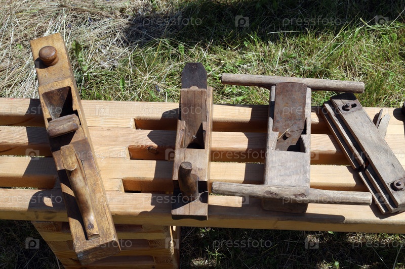Старинные столярные инструменты, разложенные на деревянной скамье