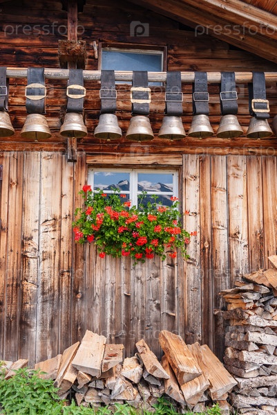 Традиционное шале с коровьими колокольчиками и цветами в Швейцарских Альпах