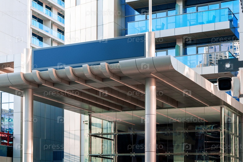 Вход в современный отель или здание апартаментов с пустой вывеской отеля. Место для текста